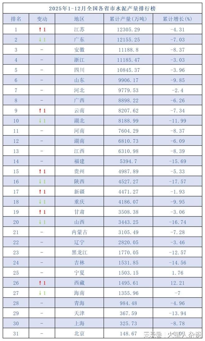 浙江位列第四,产量11185.47万吨。红狮控股集团、上峰水泥、中国建材旗下南方水泥是当地龙头企业。总部位于兰溪的红狮控股集团,是我国最大民营水泥企业,在国内12个省和老挝、尼泊尔、印尼等国家有60余家大型水泥工厂,年产能1.2亿吨,2025年实现销售收入528亿元。