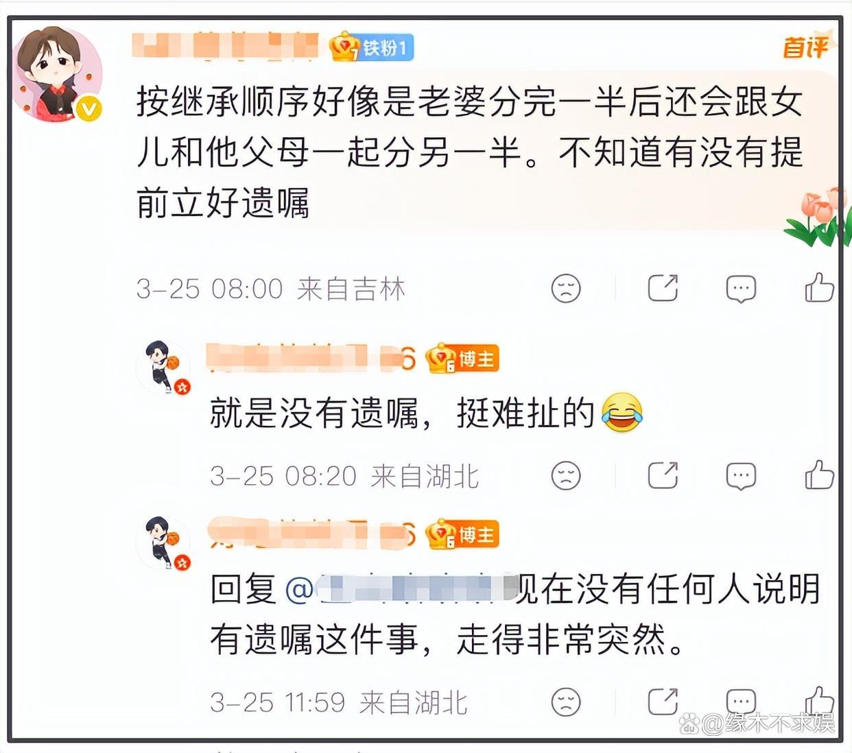 网友表示按照继承顺序,张雪峰的现任妻子可以分走其一半的遗产。这剩下的一半则是张雪峰的女儿及其父母平分。但是张雪峰女儿还年幼,显然无法独自掌管这么大的大笔的财产。