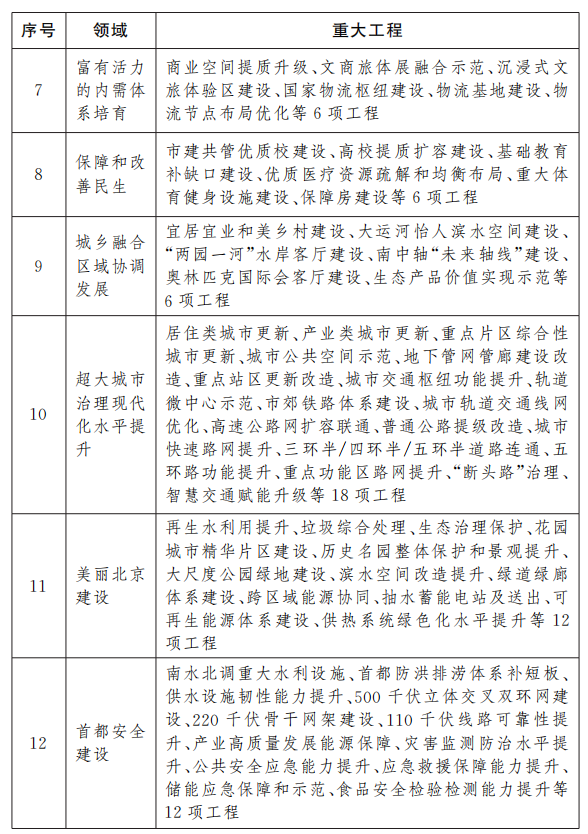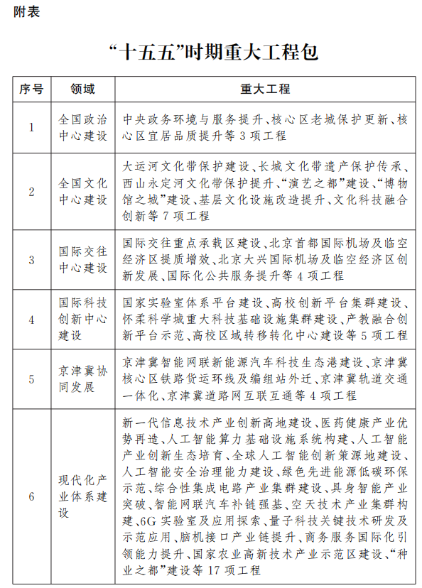 规划纲要附表内容显示,北京市本次发布的“十五五”时期重大工程包包括全国政治中心建设、全国文化中心建设、国际交往中心建设、国际科技创新中心建设、京津冀协同发展、现代化产业体系建设、富有活力的内需体系培育、保障和改善民生、城乡融合区域协调发展、超大城市治理现代化水平提升、美丽北京建设和首都安全建设共12个领域。