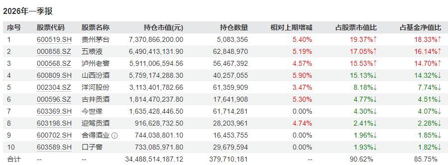2026年一季度报告显示,招商中证白酒A一季度亏损28.37亿元,期末基金资产净值为258.37亿元;单位净值为0.64元,季度内累计下跌9.95%。招商中证白酒C同期亏损15.11亿元,期末基金资产净值为143.83亿元;单位净值为0.64元,季度内累计下跌达到9.96%。